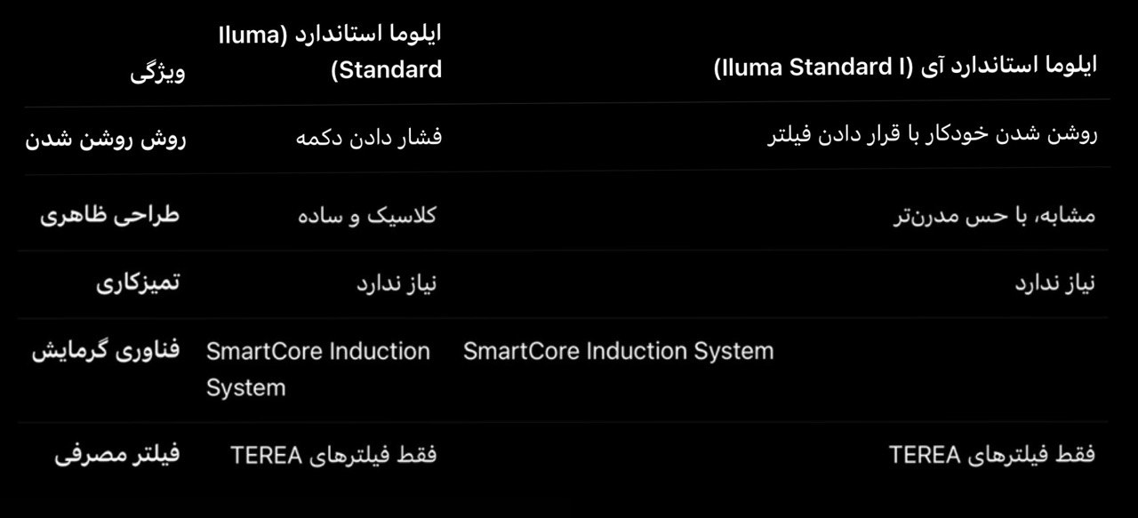 • ایلوما استاندارد آی: قابلیت پاز کردن دارد. یعنی شما میتوانید وسط مصرف دستگاه را متوقف کنید و همان فیلتر را بعداً ادامه دهید.